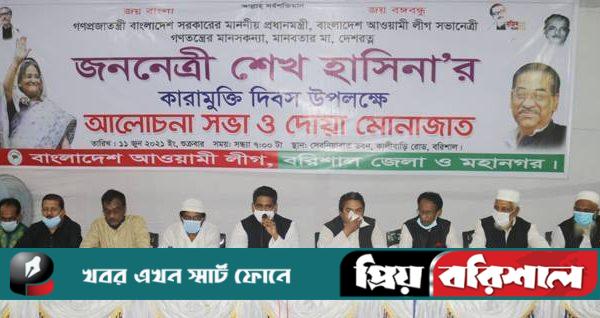 বাংলাদেশ আওয়ামী লীগের সভাপতি ও প্রধানমন্ত্রী শেখ হাসিনার কারামুক্তি দিবস উপলক্ষে বরিশালে আলোচনা সভা ও দোয়া মোনাজাত অনুষ্ঠিত হয়েছে। শুক্রবার (১১ জুন) সন্ধ্যায় নগরীর কালীবাড়ি রোডস্থ সেরনিয়াবাত ভবনে জেলা ও
