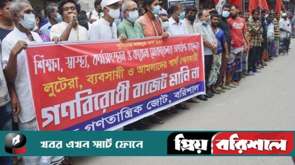 শিক্ষা, স্বাস্থ্য,কর্মসংস্থান ও করোনা মোকাবেলায় অপর্যাপ্ত বরাদ্ধে লুটেরা, ব্যবসায়ী সহ আমলাদের স্বার্থ রক্ষাকারী গণ বিরোধী বাজেটের প্রতিবাদ জানিয়ে মানববন্ধন সমাবেশ ও বিক্ষোভ করেছে বাম গণতান্ত্রিক জোট, বরিশাল জেলা কমিটি। আজ